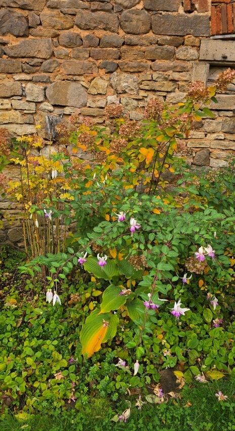 Im Oktober wird das Schattenbeet kräftiger in den Farben. Die Funkien blühen gelb ab, der Rest bleibt Grün. Die Rispenhortensien zaubern dann richtig Farbe ins Beet, wobei die Fuchsien immer noch blühen. Das Beet erhält im Herbst dann eine leicht melancholische Seite. Es stirbt und vergeht und zaubert doch mit den Farben einen Funken Hoffnung, dass im Frühjahr alles wieder von vorne beginnt.
